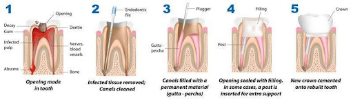 Root canal treatment involves removing the soft centre of the tooth—known as the pulp—by drilling a hole in the tooth, removing the infected pulp, disinfecting the root canals, clearing harmful bacteria, filling the inside of the tooth, and then crowning the tooth. The premise of root canal treatment is to save a tooth that is infected or decayed by removing the infected materials and thus avoid having it extracted.